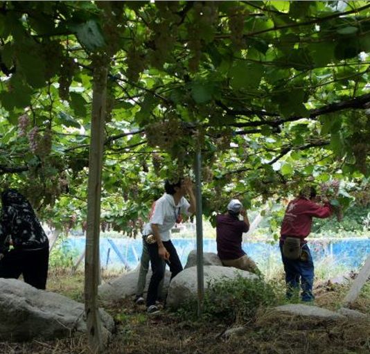 農業の未来に向けて農福連携や新規就農者を育てる活動を進めています。また、規格外ブドウを活用したワイン「kai kubota」は巨峰や甲州種やメルロー種などのワイン用の各種ブドウのを使用しています。